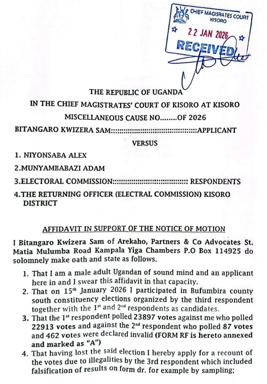 Court documents obtained by www.vomuhabura.com indicate that Bitangaro, through Arekaho Partners & Co. Advocates, is challenging the results of the January 15 election.