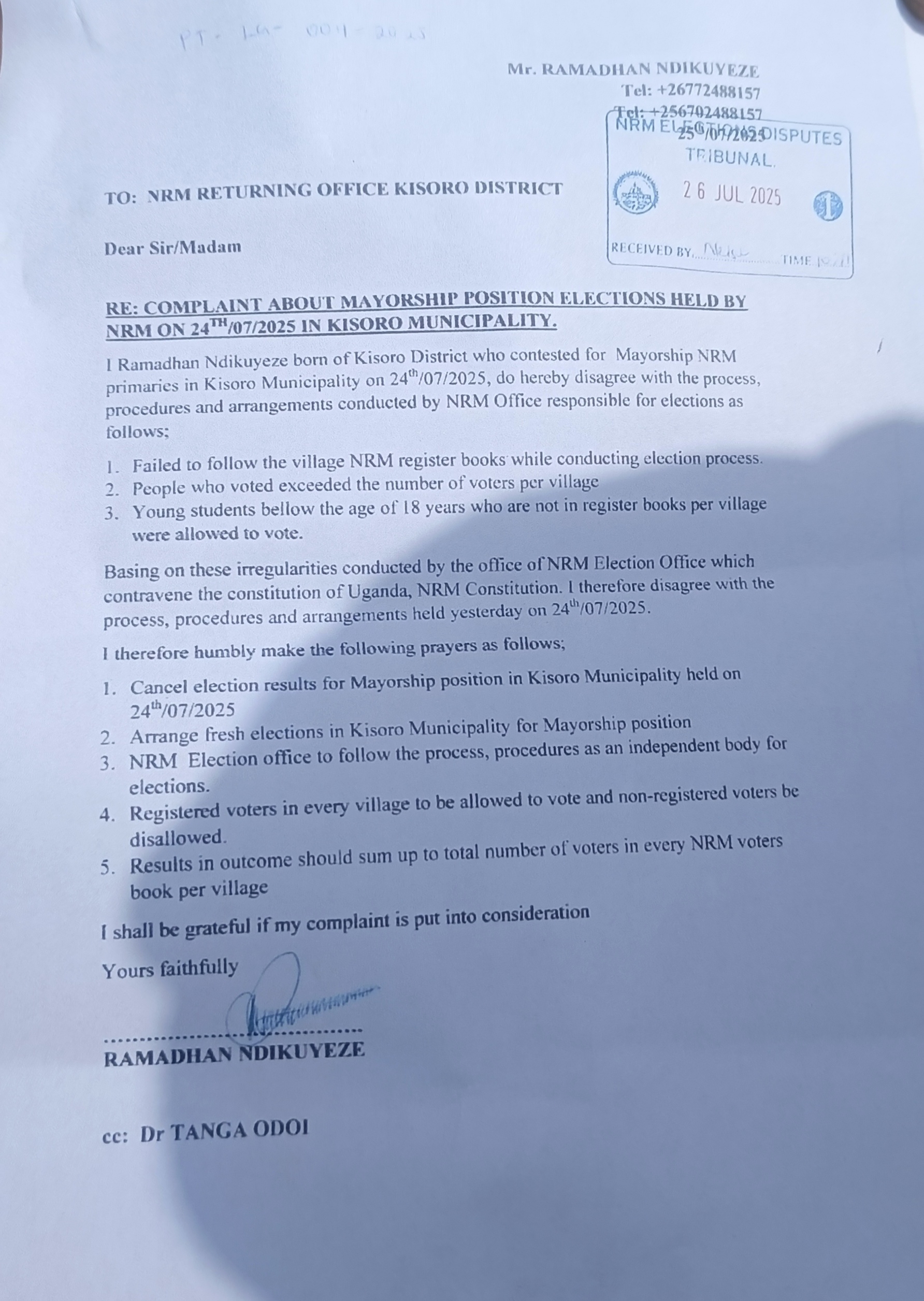Former Kisoro District NRM Vice Chairperson, Ramathan Ndikuyeze, has petitioned the NRM Elections Disputes Tribunal, citing widespread irregularities in the Kisoro Municipality mayoral primaries held on July 24, 2025.