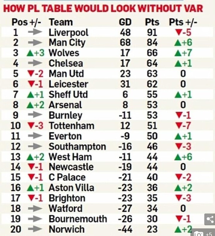 It has only changed one match from what would have been a loss without VAR to a win however — Liverpool’s 1-0 home victory against Wolves where Sadio Mane’s goal was originally chalked off and Wolves’ equaliser originally stood.