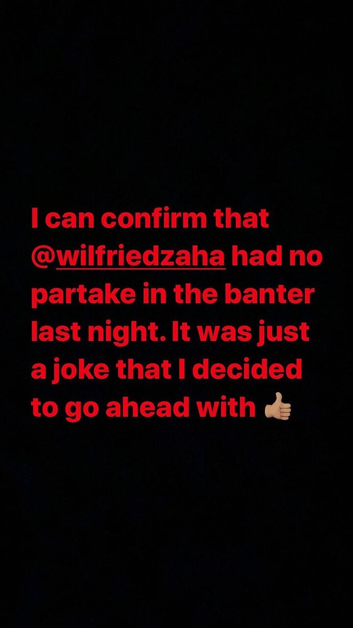 He said: ‘I can confirm that @wilfriedzaha had no partake in the banter last night. It was just a joke that I decided to go ahead with.’